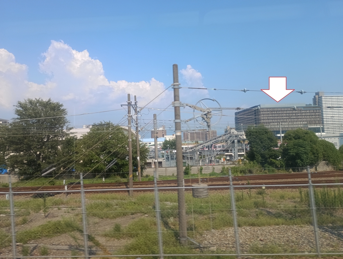 場所は、大阪市城東区。このわかりにくい写真(下)は、筆者がJR環状線の天王寺発➡大阪行きに乗り大阪城公園駅北あたりから撮ったもの。右上にある茶色っぽいの⇩建物が森ノ宮キャンパス。お隣の白いのがURさんが1970年代に建てた高層住宅群。